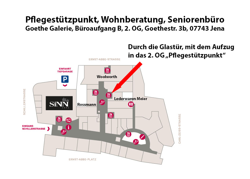 | Ort: | Pflegestützpunkt in der Goethe Galerie, Büroaufgang B, 2. OG, Goethestr. 3b, 07743 Jena |